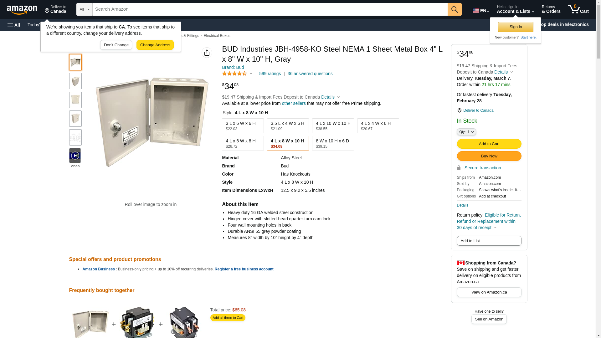 BUD Industries JBH-4958-KO Steel NEMA 1 Sheet Metal Box 4" L x 8" W x 10" H, Gray