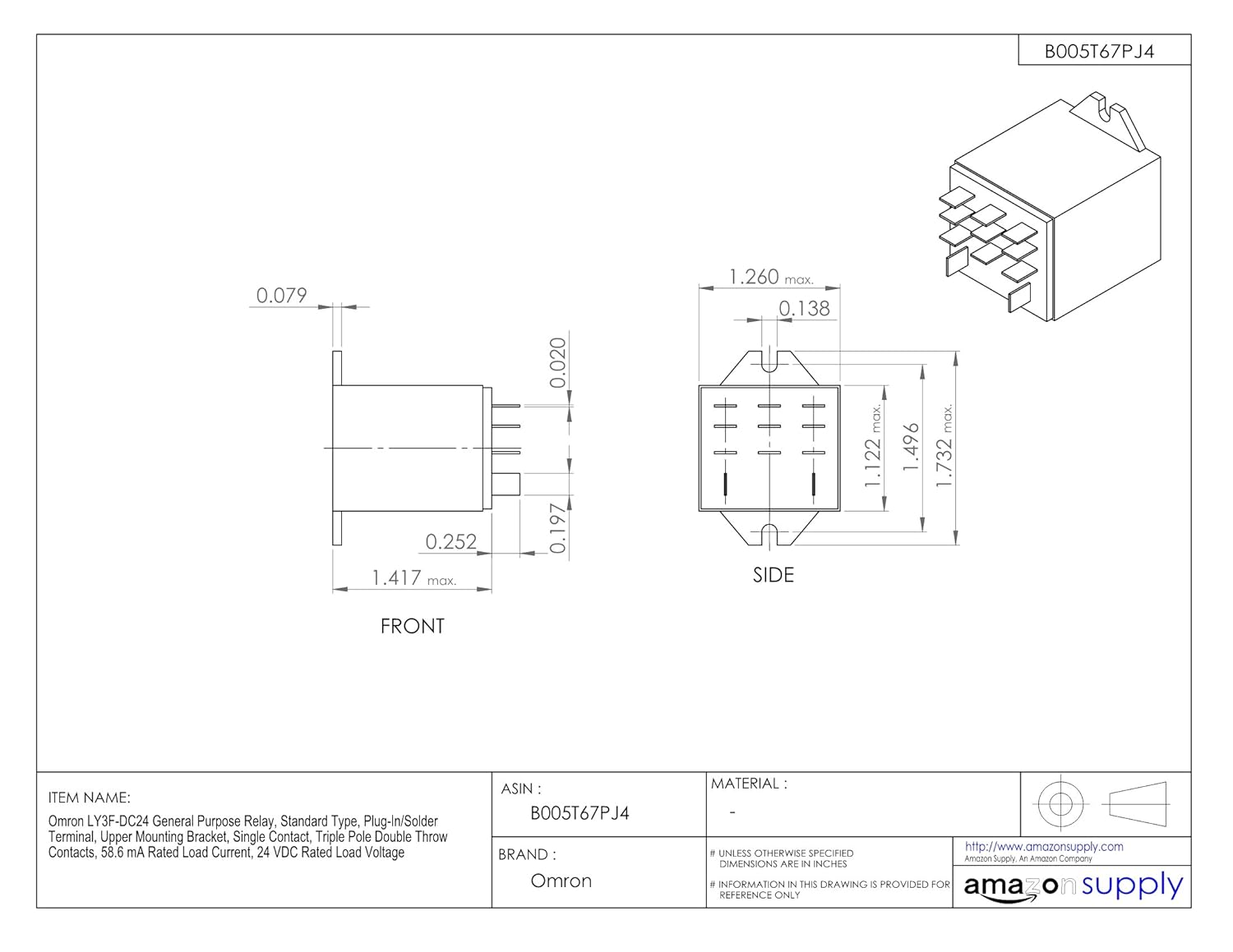 Omron LY3F-DC24 General Purpose Relay, Standard Type, Plug-In/Solder Terminal, Upper Mounting Bracket, Single Contact, Triple Pole Double Throw Contacts, 58.6 mA Rated Load Current, 24 VDC Rated Load Voltage