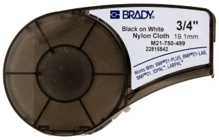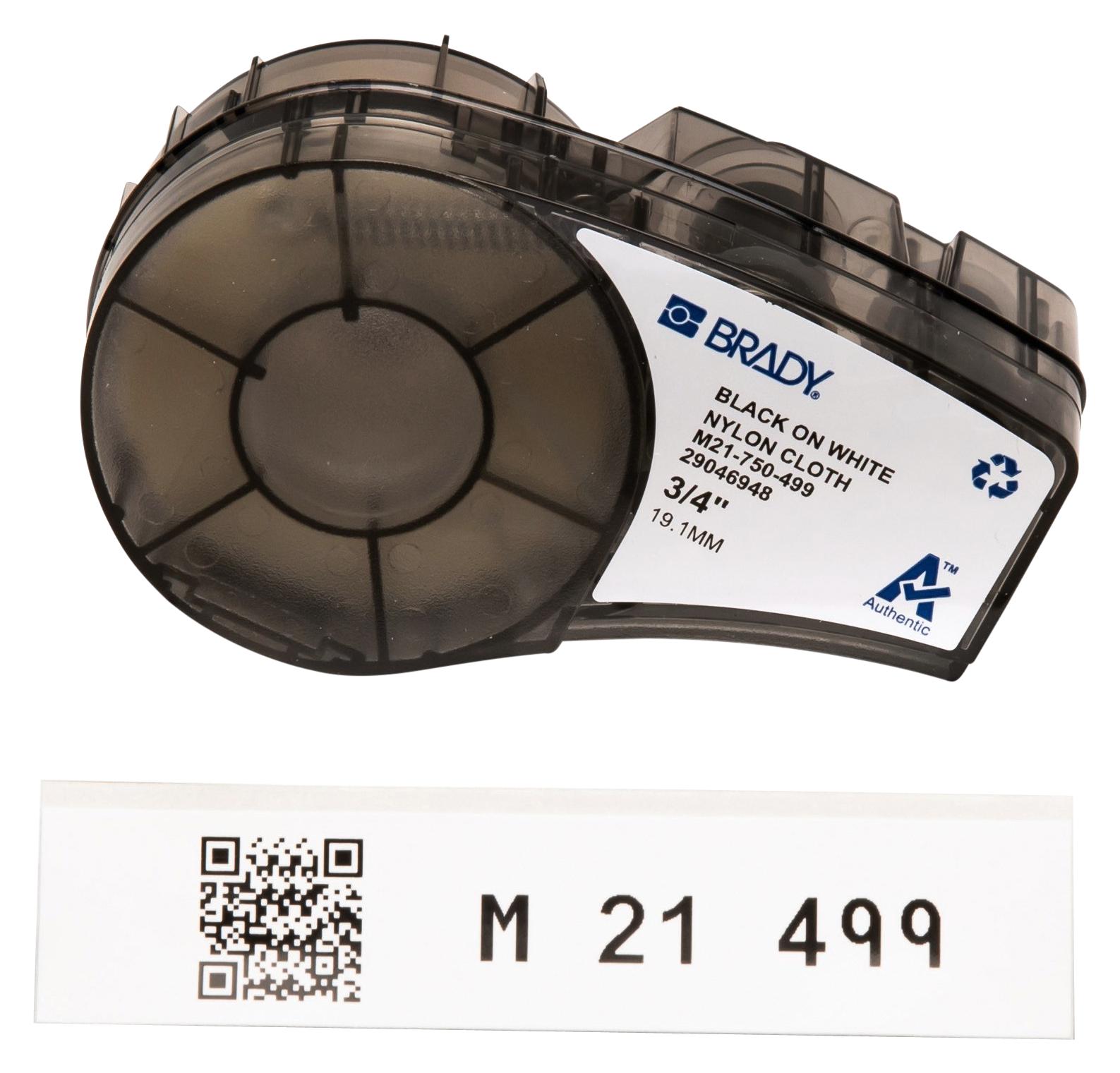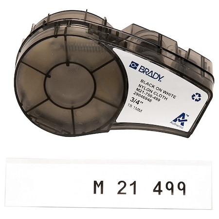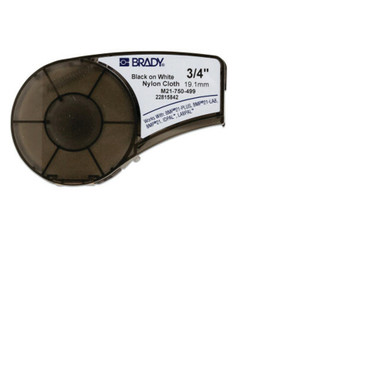 Brady M21-750-499 Nylon Cloth Label Black on White .75 W x 16' L The B-499 material has a protective polyamide coating and permanent acrylic adhesive to stay adhered to surfaces even in autoclave freezer and liquid nitrogen environments. The nylon cloth tape is ideal for use in cable and wire labeling general-purpose marking in labs equipment panels and faceplates. The low-profile tape adheres to surfaces that are smooth rough or powder coated as well as to irregular surfaces or surfaces with low surface energy. M21-750-499