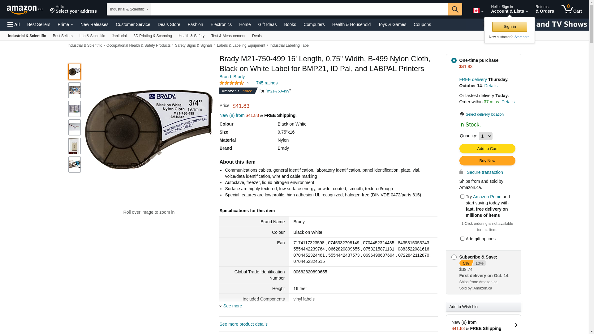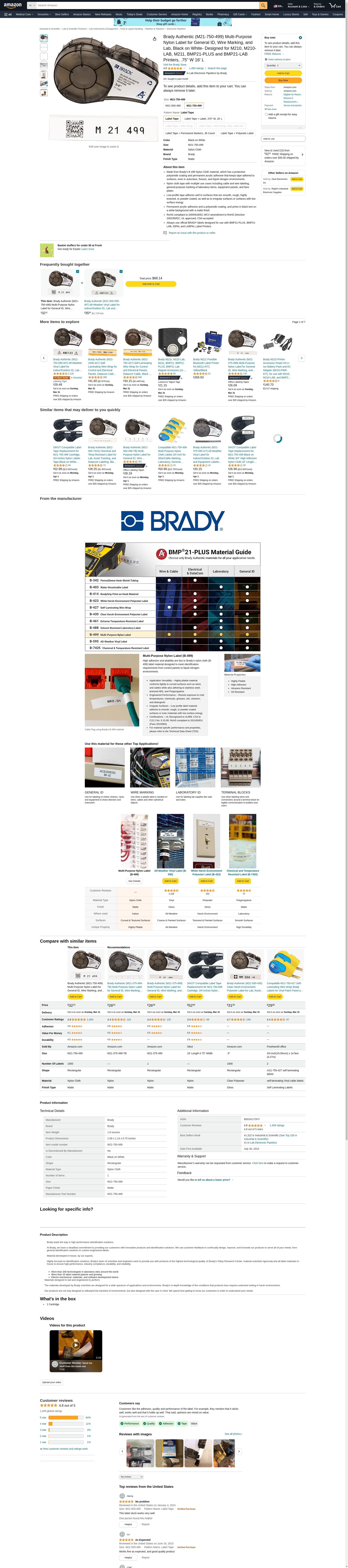 The Brady M21-750-499 B-499 nylon cloth tape is 0.75" wide and 16' long, has a permanent acrylic adhesive and a polyamide coating, and prints in black text on a white background with a matte finish. It can be used for marking cables and wires, and for general-purpose labeling on laboratory items, equipment panels, and faceplates. Nylon cloth tape is durable, has good chemical resistance, and resists abrasion. It is made from Brady's B-499 nylon material, which has a protective polyamide coating and permanent acrylic adhesive that keeps tape adhered to surfaces, even in autoclave, freezer, and liquid nitrogen environments (not recommended for outdoor use). This low-profile tape adheres well to surfaces that are smooth, rough, highly textured, or powder coated, as well as to irregular surfaces or surfaces with low surface energy. It is intended for use with Brady MP21, ID PAL, and LABPAL label printers. Brady M21-750-499 printer label is an Underwriters Laboratories (UL) Recognized component that complies with UL969 labeling and marking standards when used with the appropriate printer. This product meets the requirements of a halogen-free material per Deutsches Institut für Normung (DIN) standard VDE 0472, part 815.