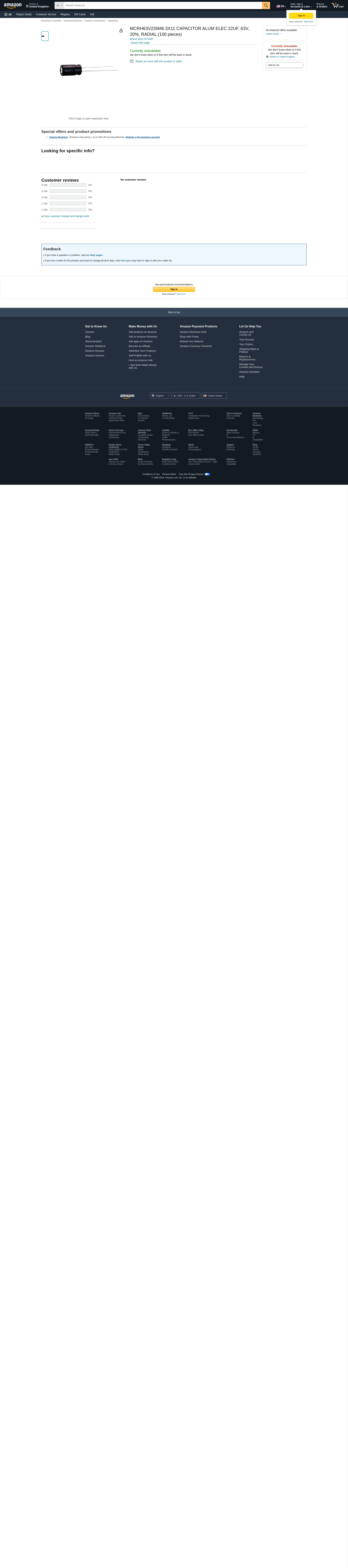 ALUMINUM ELECTROLYTIC CAPACITOR 22UF, 63V, 20%, RADIAL; Capacitance:22µF; Voltage Rating:63V; Product Range:MCRH Series; Capacitance Tolerance:± 20%; Capacitor Terminals:Radial Leaded; Lifetime @ Temperature:2000 hours @ 105°C; ESR:-RoHS Compliant: Yes