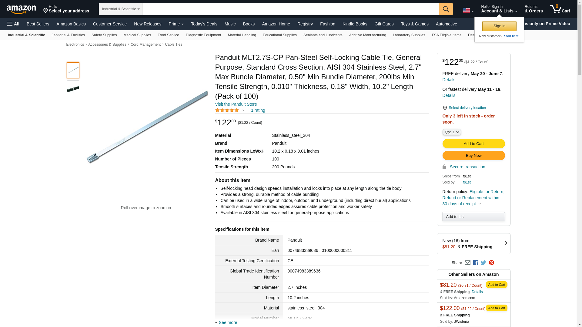 Panduit MLT2.7S-CP Pan-Steel Self-Locking Cable Tie, General Purpose, Standard Cross Section, AISI 304 Stainless Steel, 2.7" Max Bundle Diameter, 0.50" Min Bundle Diameter, 200lbs Min Tensile Strength, 0.010" Thickness, 0.18" Width, 10.2" Length (Pack of 100)