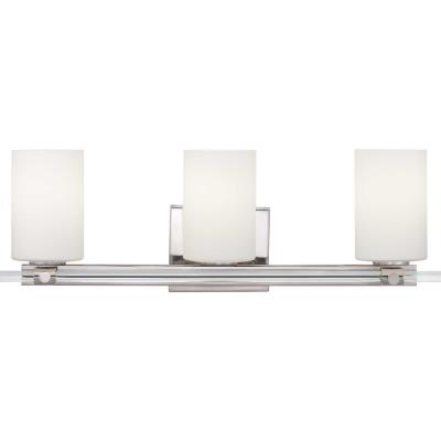 - bath bathroom interior inside indoor vanity powder room powderroom light lights lighting fixture fixtures brushed nickel silver gray grey luxe modern medium base bulb CFL LED incandescent dimmable 3 three etched opal glass