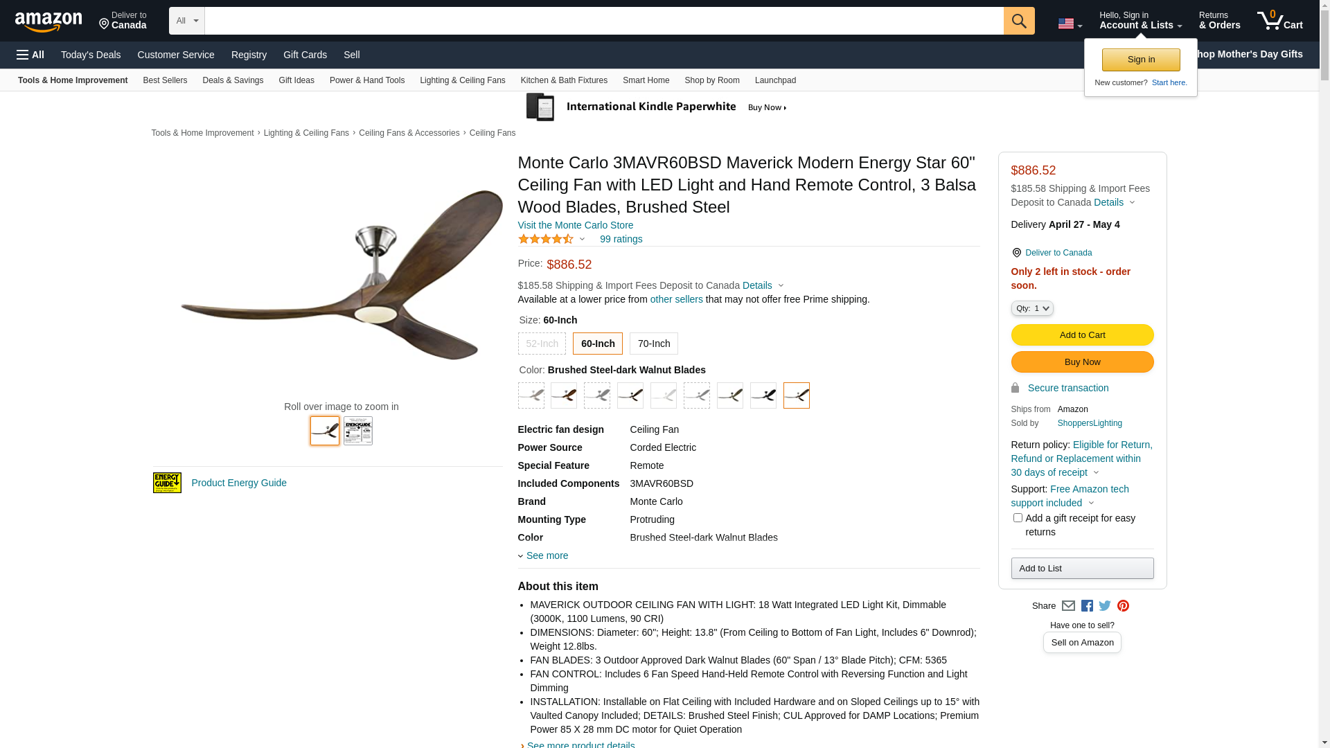 - FAN BLADES: 3 Outdoor Approved Dark Walnut Blades (60" Span / 13° Blade Pitch); CFM: 5365