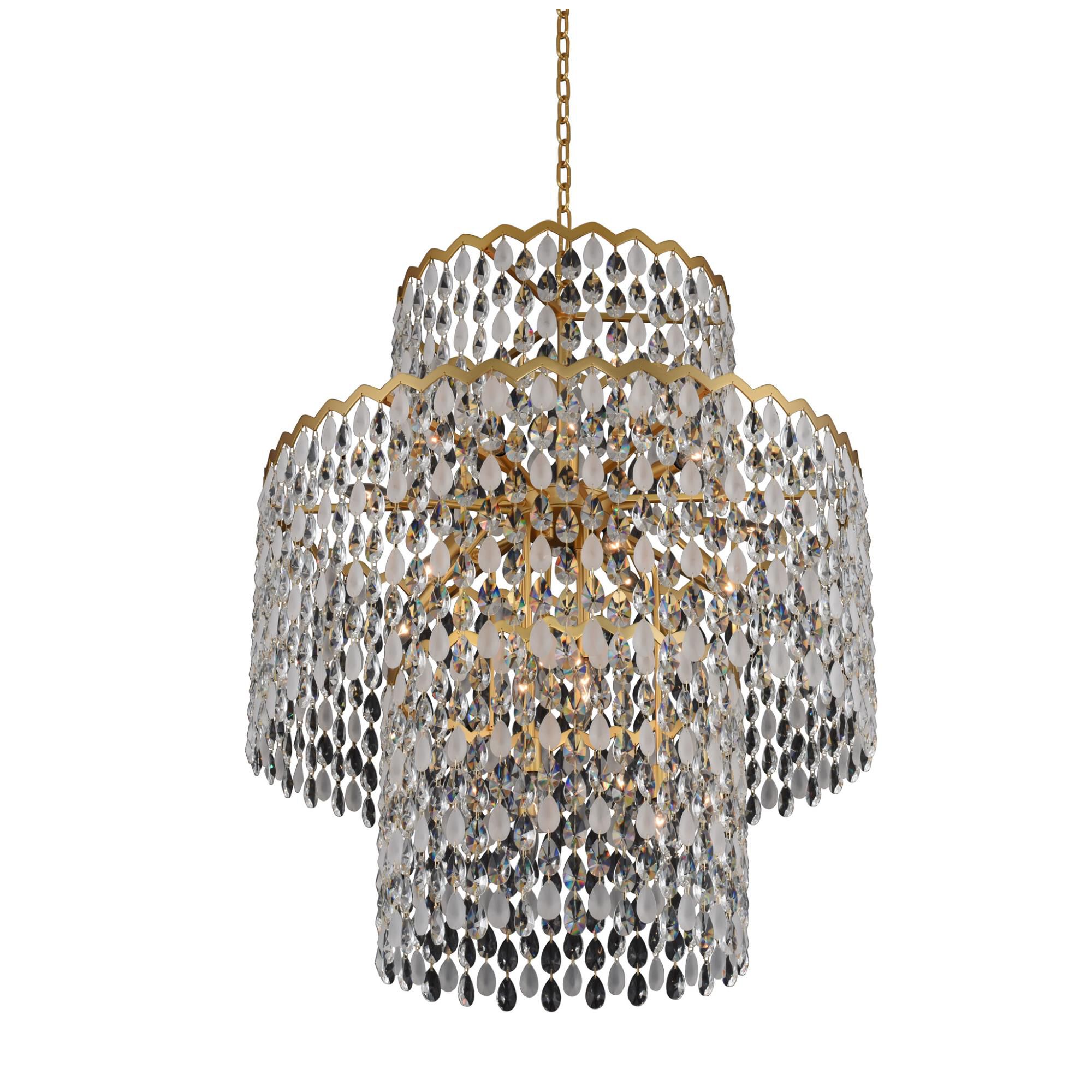 The Collection features a scalloped frame in a bright antique brass finish with both frosted and clear Firenze crystal drops. 21 Light Pendant Collection: Caretta Finish: Antique Brass Width: 35.00`` Height: 42.00`` Length: 35.00`` Safery Rating: cETL Safety Listing: Dry Bulbs: 21 X Candelabra 40.00W UL Approved Hardiwred Bulbs Not Included
