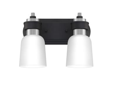 The transitional style of the Conrad collection is both sleek and modern. A stately silhouette finished in matte black and accented with brushed nickel creates the perfect amount of sophistication, and the etched glass shades add a pleasant glow to any room. 9.00" H 12.50" W 7.25" L -Bulb Type MED BASE A19 -Bulb Qty 2 -Base Finish BN - Brushed Nickel -ShadeType Cone -Item Weight 5.64 -BP Height In 4.50, BP Width In 12.00 - Product Design Style: Transitional Product Finish: Nickel Product Electical: Product Shade: ETCHED GLASS Product Warranty: Product Warranty: Indoor Lighting Fixtures-Electrical Components [1 Year], Integrated LED (LED Bulbs Excluded)[5 Years], Finish[1 Year]; Outdoor Lighting Fixtures-Electrical Wiring & Sockets [1 Year], Integrated LED (LED Bulbs Excluded)[5 Years], "Armour" Finish[5 Years], Finish[2 Years]. Mounting Direction: Up/Down / Assembly Required: Yes / Shade Included: Yes / Cord Length: 6.00 / Dimable: Yes. <UL>Bathroom<LI>Mounting Direction: Up/Down / Cord Length: 72.00. Assembly Required: Yes / Back Plate Height: 4.50 / Back Plate Width: 12.00 / Bulb Shape: A19 / Dimable: Yes / Shade Included: Yes.