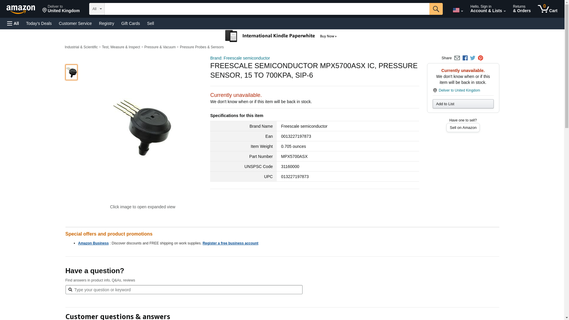 - Price For: Each Pressure Type: Absolute Operating Pressure Min: 15kPa Operating Pressure Max: 700kPa Supply Voltage Min: 4.75V Supply Voltage Max: 5.25V Sensor Case Style: SIP No. of Pins: 6 RoHS Compliant: Yes