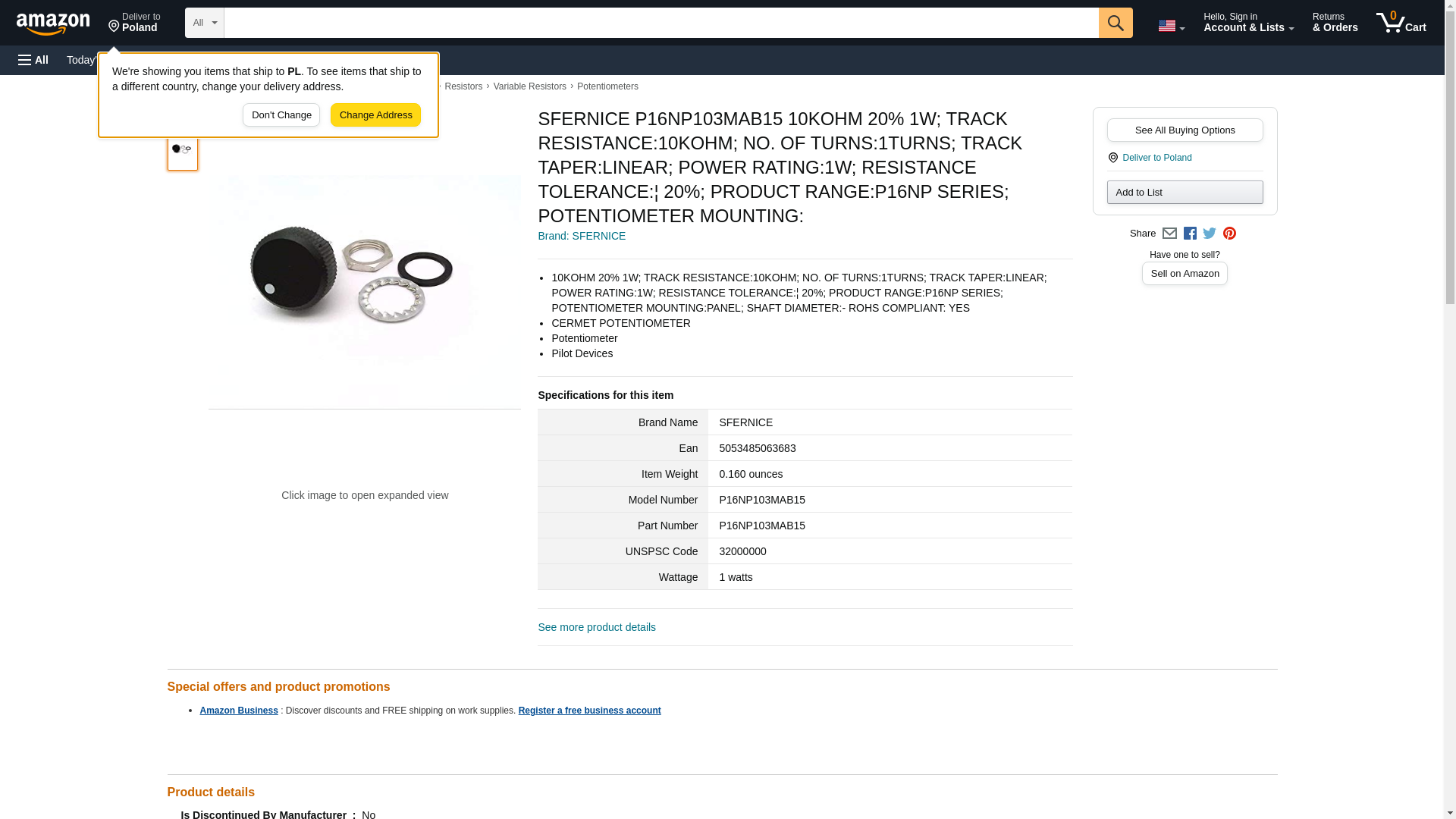 SFERNICE P16NP103MAB15 Panel Mount, CERMET Type, 100V, 1 Gang, KNURLED/Serrated Shaft, Solder Lug Terminal, 10KOHMS, 1 Turn, 1 WATT, Potentiometer, Linear Taper, P16 Series