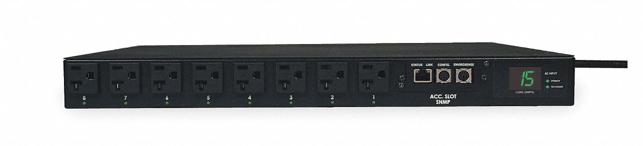 - 1U horizontal rackmount; 2 NEMA 5-15P inputs; 8 NEMA 5-15R outlets