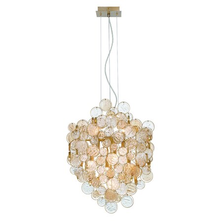 Collection: Trento, Material: Metal, Finish Color: Antique Gold, Width: 10.5", Height: 25", Length: 19.5", Hanging Method: Cord, Chain Length: 72", Lamping Type: Halogen, Number Of Bulbs: 7, Wattage: 280 Watts, Dimmable: Yes, Moisture Rating: Dry Rated, Desc: Intricate champagne silver or antique gold frames delicately hand strung glass wafers. The pressed glass, each one a distinguished piece of craftsmanship, float beautifully like clouds. Hand pressed glass. Room Recommendation: Living Room/EntryWay / Assembly Required: Yes / Mounting Direction: Multi / Canopy Included: Yes / Canopy Diameter: 5.50 / Sloped Ceiling Adaptable: Yes / Dimmable: Yes . . ,