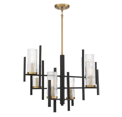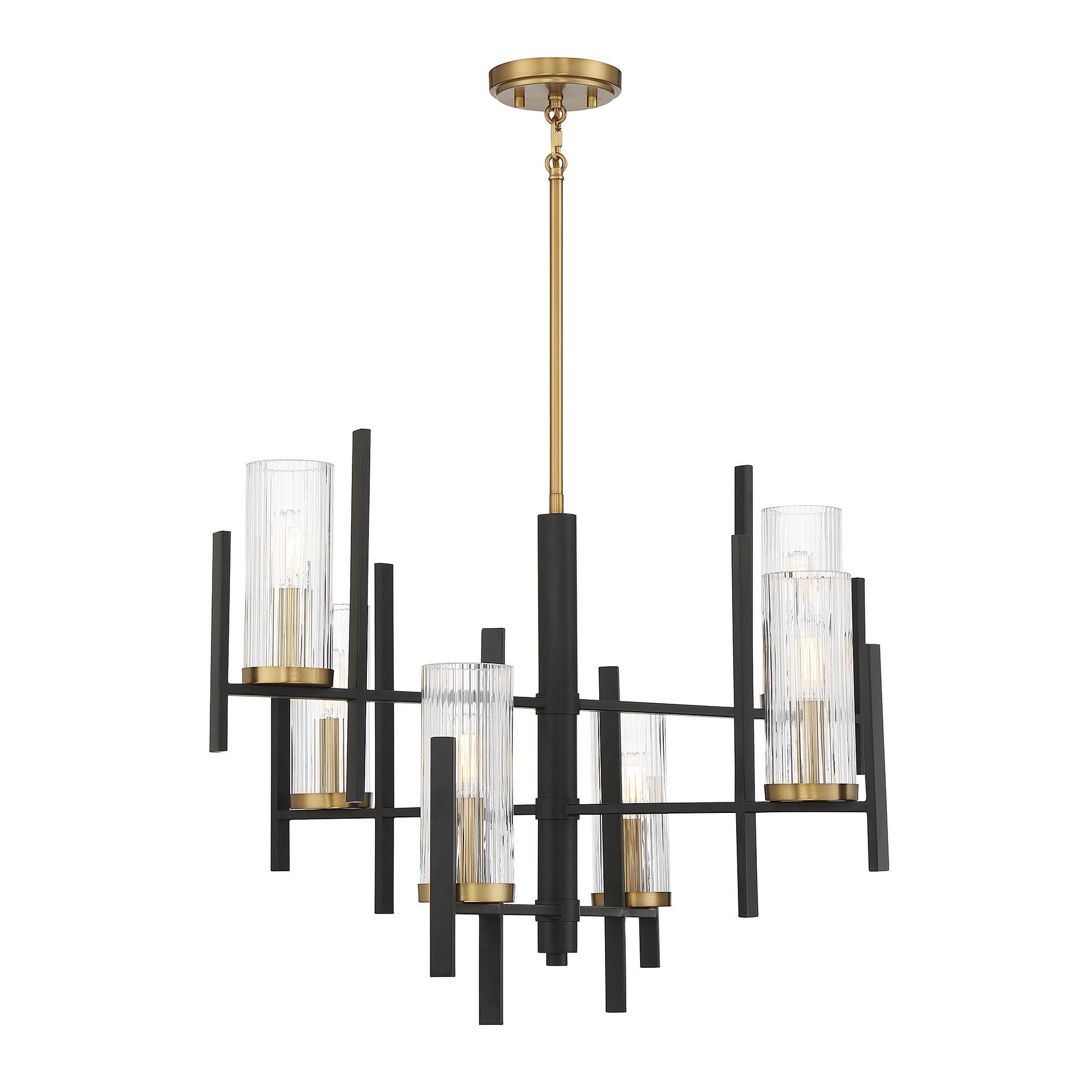 Bring in the midcentury modern inspired look of the Savoy House Midland 6-light chandelier. Tall shades of clear ribbed glass sit within a sharp, intriguing frame finished in the beautiful pairing of matte black and warm brass. Midland is 28" in width and has an adjustable height ranging from 21" to 75". It uses six candelabra size bulbs of up to 60 watts per bulb. Comes with four 12" downrods and one 6" downrod, plus 80" of cord.