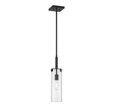 This Savoy House Winfield 1-light mini pendant showcases a bold, slim look with a shade of clear glass, thoughtful minimal detailing and a matte black finish. It is 5.125" in width and has an adjustable height ranging from 15.75" to 47.25". It uses one standard size bulb of up to 60 watts. Comes with three 9.5" downrods.