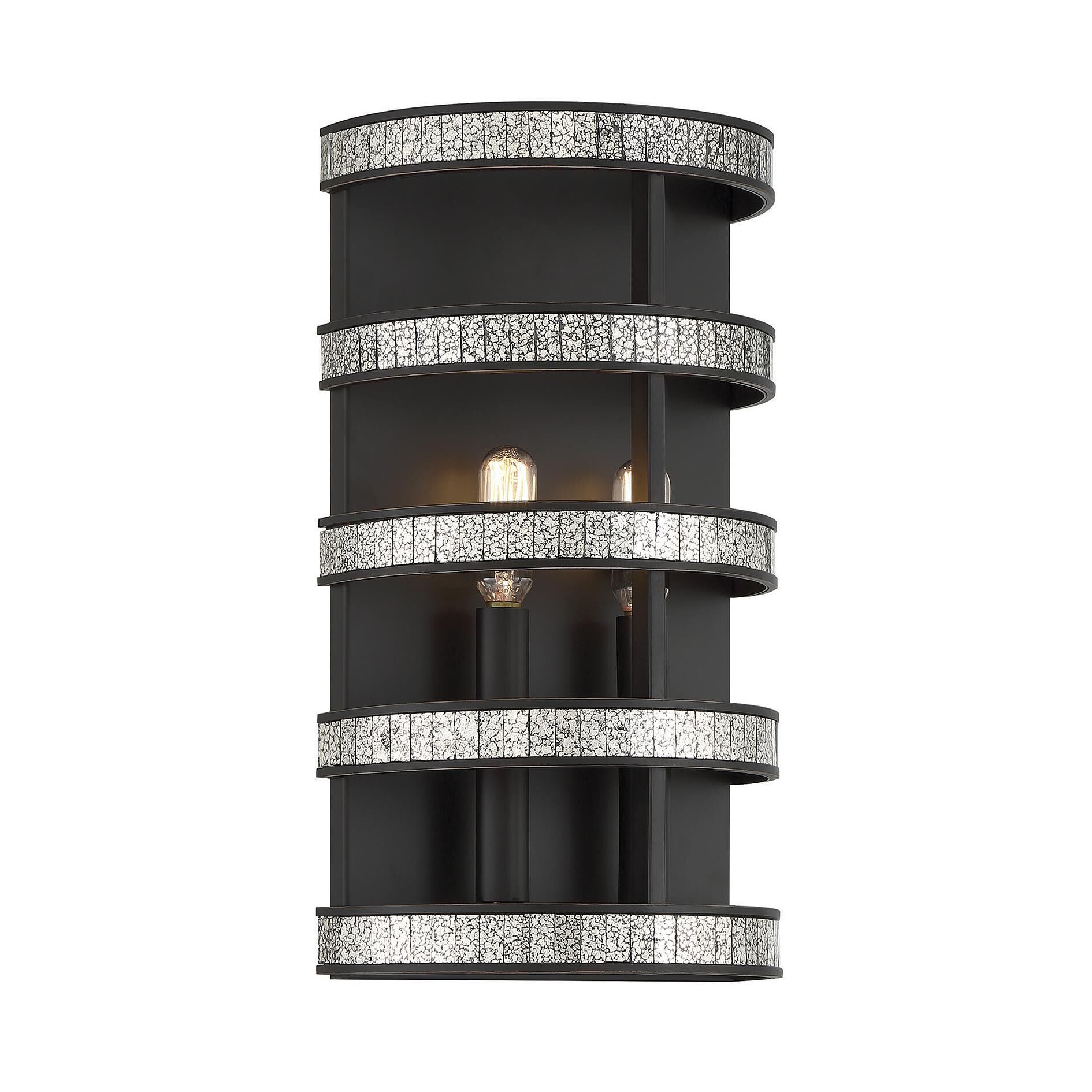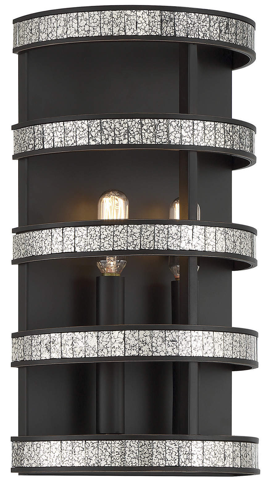 Five bands decorated with antique mirror slices and finished in English bronze create a stunning, hypnotic look in the magnificent Savoy House Madera 2-light sconce. It is sure to become a beautiful bright spot in any room. Finished in English bronze. Madera is 14" in height, 8" in width and extends 4.5" from the wall. It uses two candelabra size bulbs of up to 60 watts per bulb. Damp area rated.