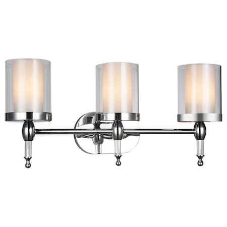 Modern simplicity combined with understated sophistication. This Maybelle 3 Light Wall Sconce features a three-arm frame in chrome finish holding three glass candleholders. This vanity light showcases the perfect balance of form and function. Expect this wall-mounted light fixture to provide a diffused light and a flattering glow to your bathroom. Lighting is jewelry for the home, and there is the perfect piece for every room. This fixture is done in a beautiful chrome finish which could be the missing piece to lighten up and fall in love with your space all over again.<br/><br/>Features :<br/><br/>- Feel confident with your purchase and rest assured. This fixture comes with a one year warranty against manufacturers defects to give you peace of mind that your product will be in perfect condition.<br/>- Dimensions: H 10" x W 24" x L 6"<br/>- Chrome Finish - E26 Bulb Not Included - Indoor (Dry Location)<br/>- cETLus Approved<br/>- Includes Assembly Instructions and Hardware<br/>- Compatible With Standard Low Voltage Dimmer.<br/><br/>Specifications :<br/><br/>- Number of Lights : 3<br/>- Voltage : 120v<br/>- Bulb Type : E26<br/>- Warranty Description : One year warranty against manufacturers defect<br/>- Installation Type : Hardwired<br/>- Material : Metal.