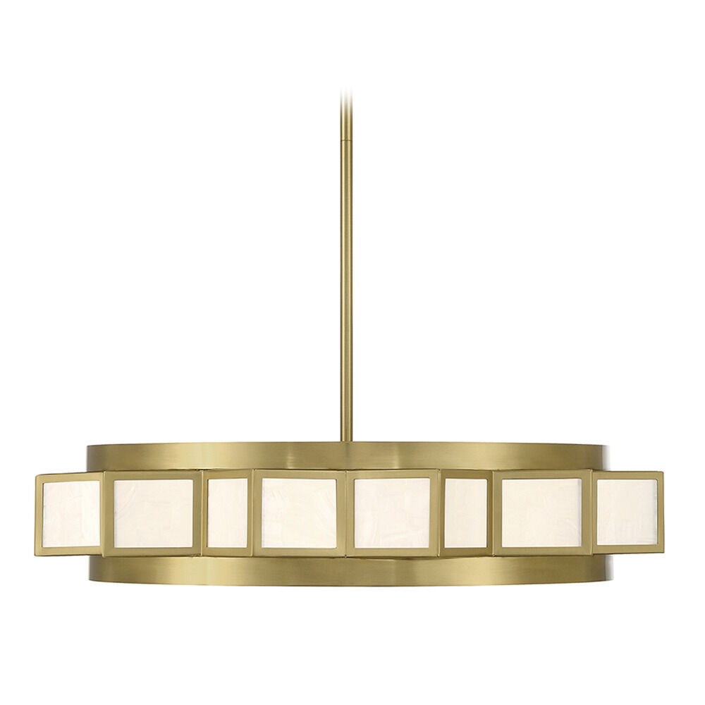 It is often said that lighting is the jewelry of the home and the Savoy House Gideon 4-light chandelier is an excellent example of this saying. Pieces of natural capiz shell are arranged into a boldly geometric frame with a warm brass finish. When the light is off, the unique swirls and patterns on the shell will mesmerize. When the light is on, the shell will create a beautifully soft glow. Gideon is 24" in width and has an adjustable height ranging from 5" to 59". Comes with four 12" downrods and one 6" downrods. It uses 4 standard size bulbs of up to 60 watts per bulb (bulbs not included).