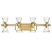 This Savoy House Bennington 8-light bath vanity light features pleasantly curving shapes that combine to create an intriguing lighting look. Fluted clear glass shades and thoughtful detailing on the structure, finished in warm brass, gives the impression of motion. Bennington is 8.75" in height, 32" in width and extends 6" from the wall. G9 bulbs are included.