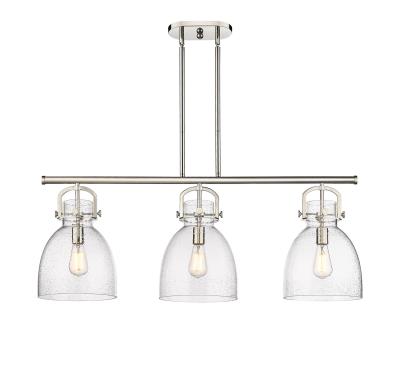 INNOVATIONS 410-3I-PN-G412-10SDY Newton Bell 3 41.5 inch Island Lighting Polished Nickel. Style: Industrial, Farmhouse, Restoration-Vintage. Collection Name: Downtown Urban. Metal Finish(Body): Polished Nickel. Material: Steel, Cast Brass, Glass. Dimension(in): 16.375(H) x 41.5(W) x 10(Ext). Bulb: (3)60W Medium Base Incandescent(Not Included). Stem Specs: 1-6 and 2-12 inch (5/8 diameter) stems. Voltage: 120. Dimmable: Yes. Color Temperature (Kelvin): 2200. Color Rendering Index (CRI): 99.9. Lumens: 220. Life Expectancy (Hours): 2000. Glass Shade Description: Seedy Newton Bell. Glass Type: Seeded. Shade Shape: Bell. Glass or Metal Shade Color: Seedy. Shade Material: Glass. Shade Dimension(in): 10(W) x 12.5(H). Sloped Ceiling Compatible: Yes. California Proposition 65 Warning Required: Yes. UL/ETL Certification Type: Damp Location.