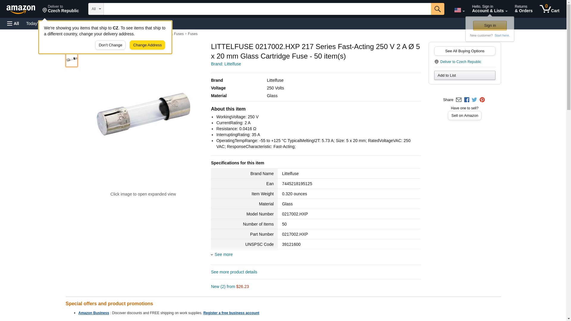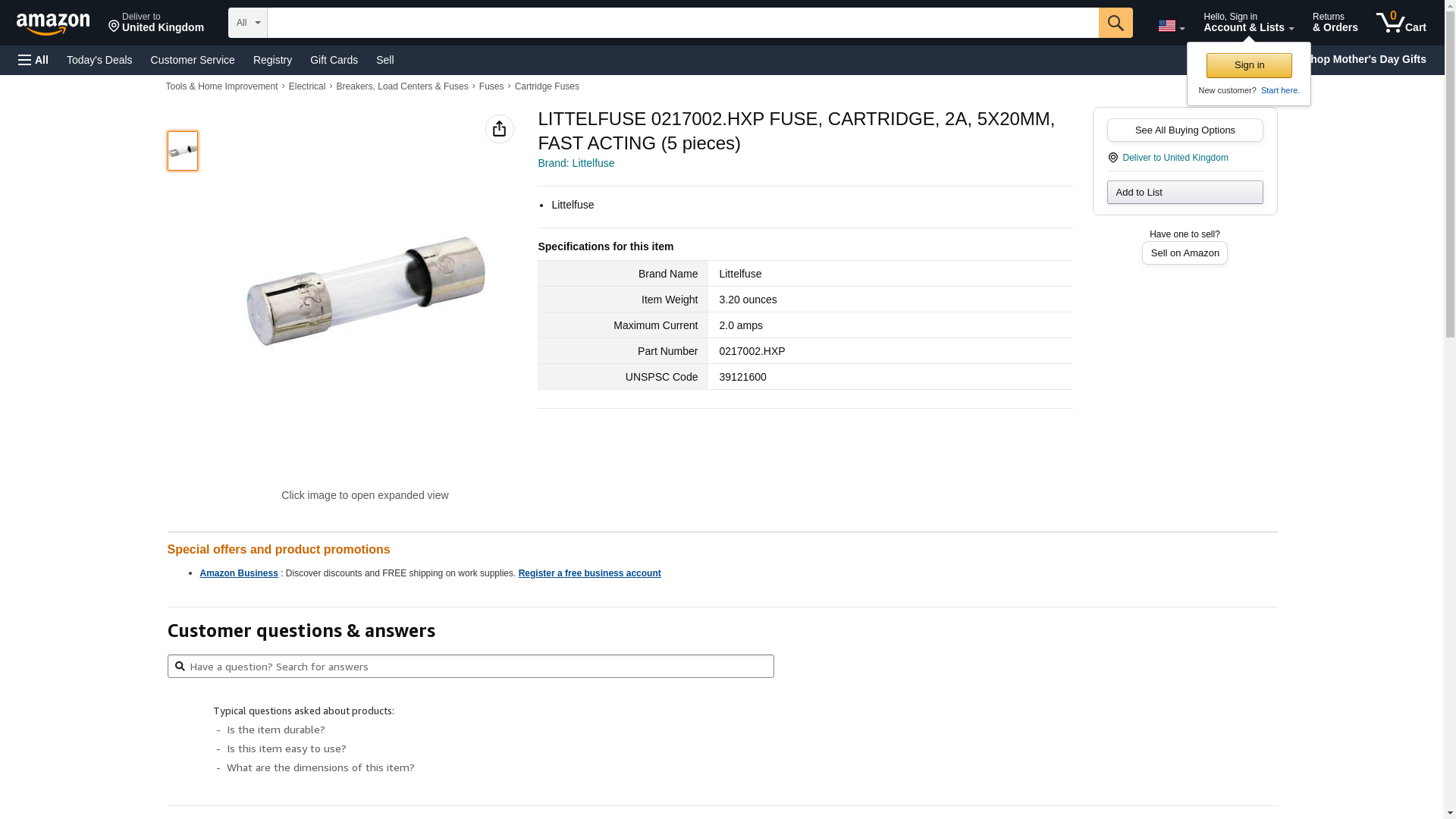 | Feature | LITTELFUSE 0217002.HXP FUSE, CARTRIDGE, 2A, 5X20MM, FAST ACTING |