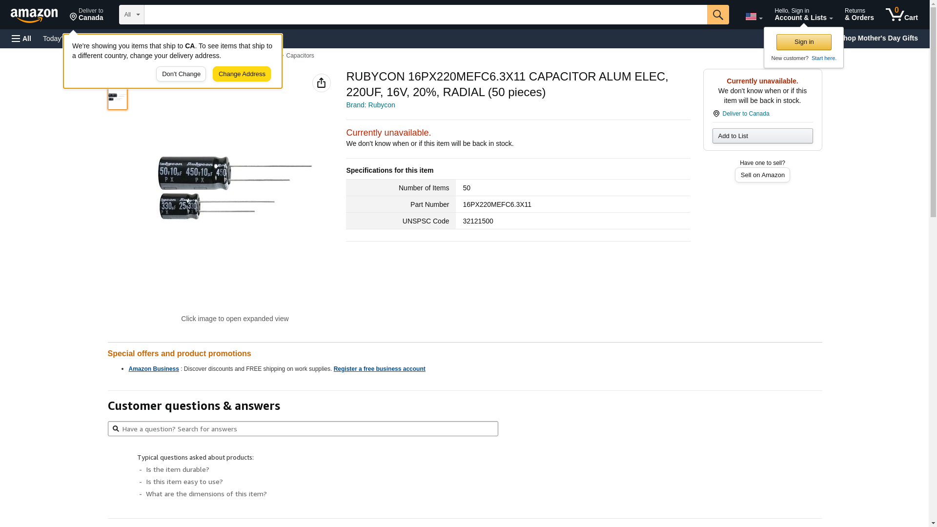 RUBYCON 16PX220MEFC6.3X11 CAPACITOR ALUM ELEC, 220UF, 16V, 20%, RADIAL (1000 pieces)