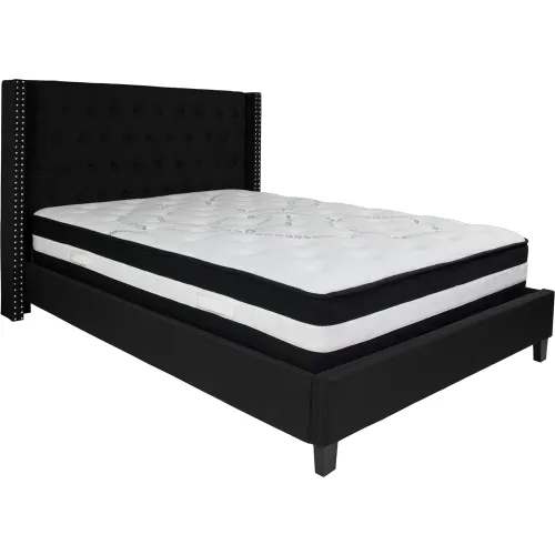Flash Furniture Riverdale Queen Size Tufted Upholstered Platform Bed in Black Fabric with Pocket Spring Mattress