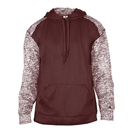 7 oz., 100% polyester moisture managenent fleece fabric ; Sublimated digital side, sleeve panels and hood liner. ; Front pouch pocket with two hook loop closures with headset opening.; Self-fabric cuffs and waisband. Contrast stitching.; Embroidered Badger logo on left sleeve;