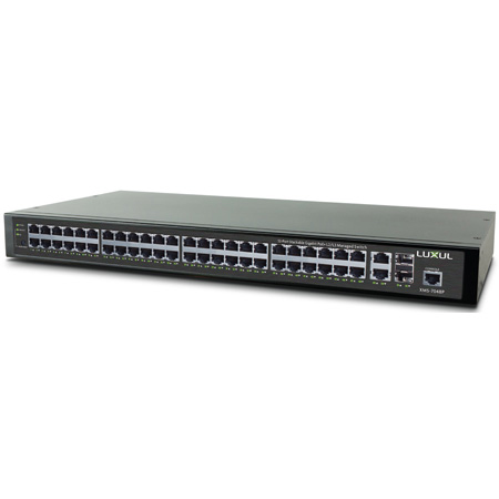 The Luxul 52-Port Stackable Gigabit PoE+ L2/L3 Managed Switch (<b>XMS-7048P</b>) is an excellent choice for expanding your network when using PoE-enabled devices such as Touch Panels, VoIP, IP cameras and Wireless Access Points. The 52-port Gigabit switch includes 48 PoE+ ports, 2 Gigabit RJ-45 ports and two 10 Gigabit SFP+ stacking ports for seamless scalability/management of up to 16 switches (800 ports). With PoE+, you can use standard Ethernet cable to deliver both power and high speed data to 802.3af/at-compliant devices, with a total power budget of 740 Watts. The advanced Layer 2/Layer 3 features and simple-to-use management interface helps to optimize network traffic.</p><p><b>Highlights</b>:<br /><li>Stackable to 16 Switches (800 Ports)</li><li>48 PoE+ Ports (740W Power Budget)</li><li>Layer 2 and Layer 3 Functionality</li>RPS Enabled</li><li>Optimized for HD Over IP Applications</li></p>