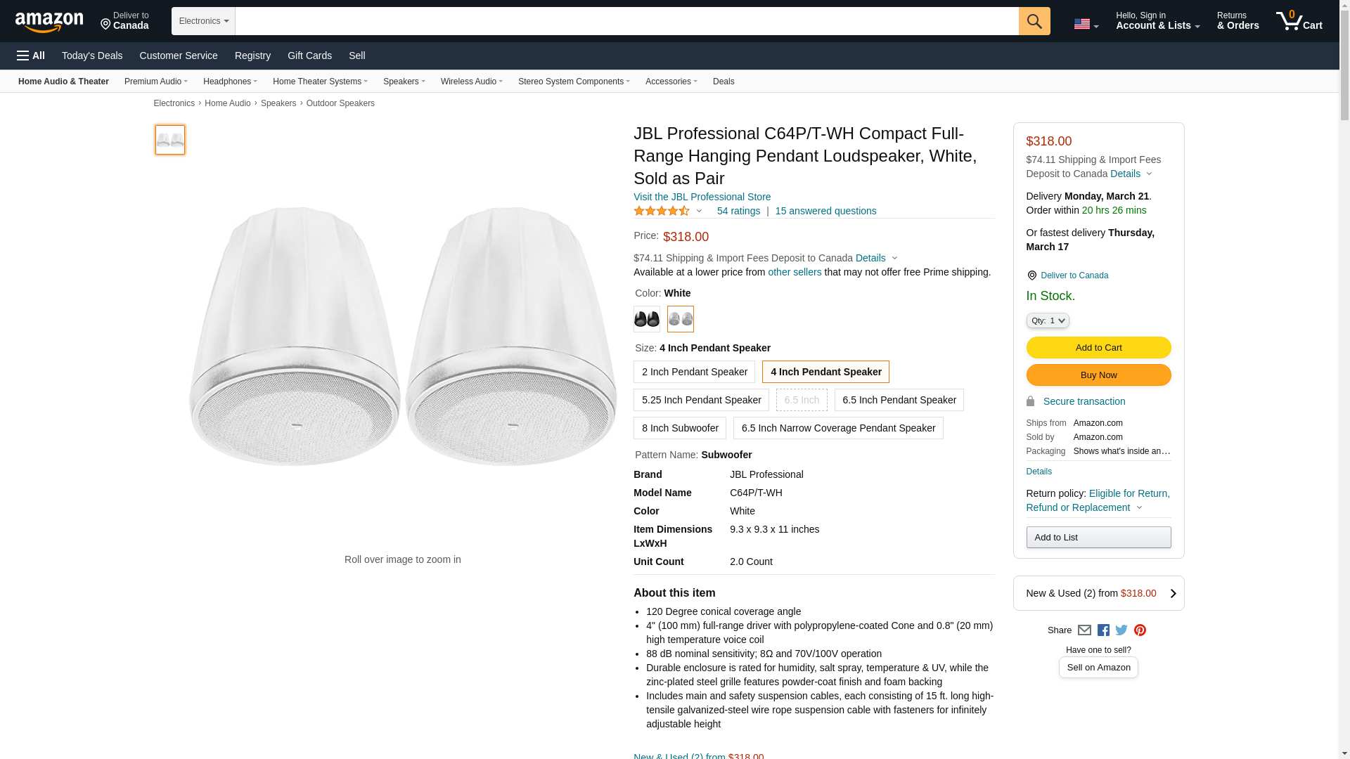 JBL Professional C64P/T-WH Compact Full-Range Hanging Pendant Loudspeaker, White, Sold as Pair