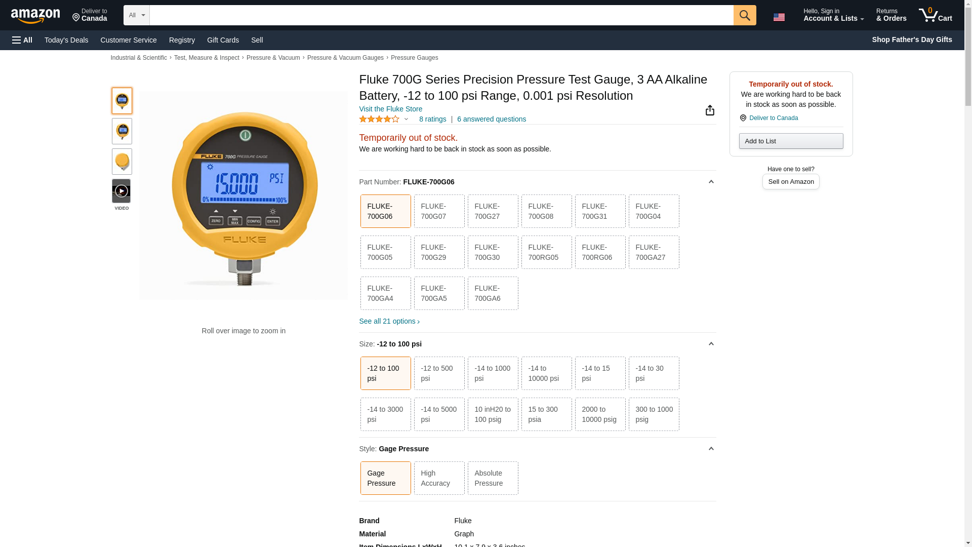 | Feature | FLUKE FLUKE-700G06 CALIBRATOR, PRESSURE, -12 TO +100PSI |