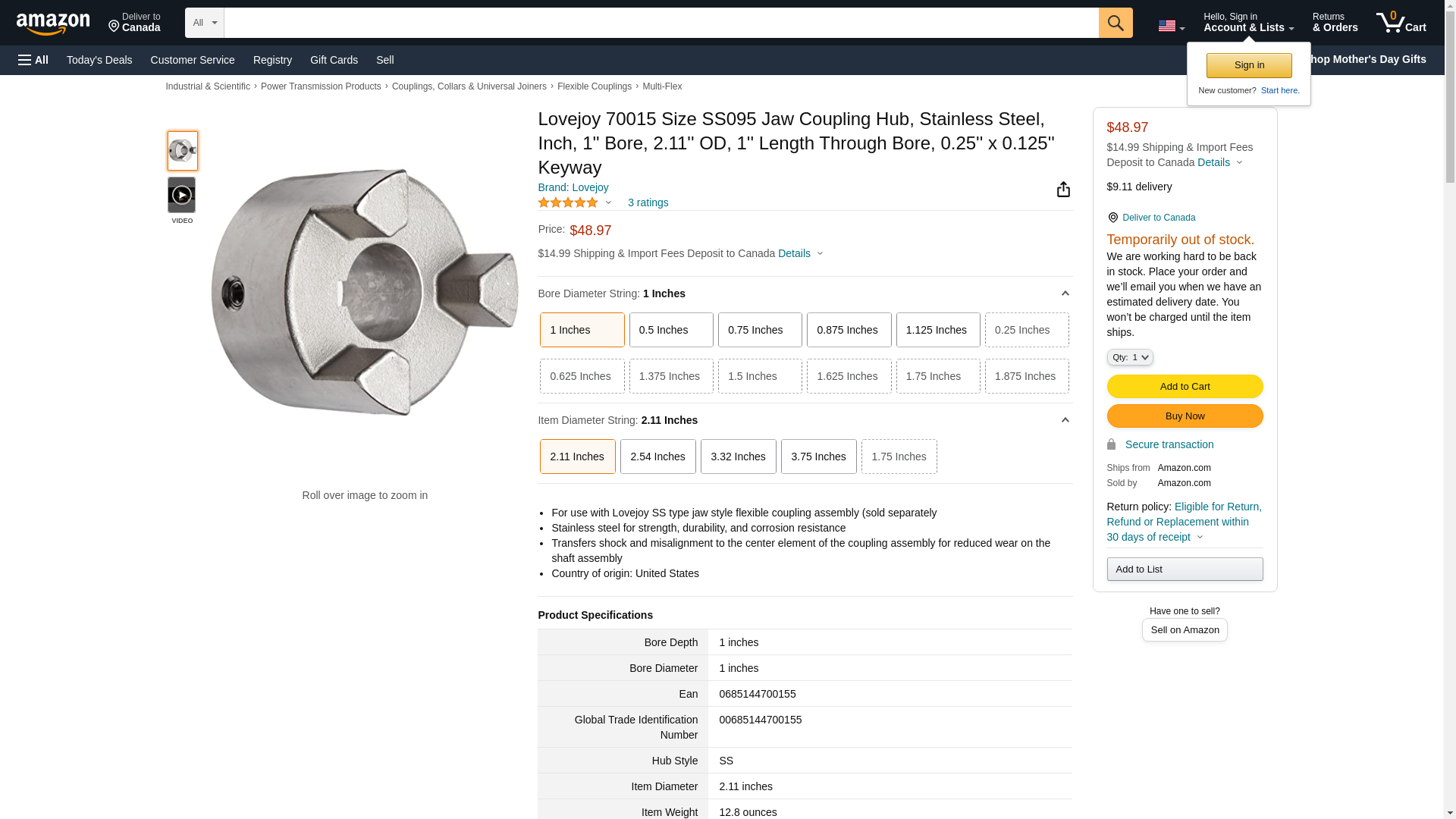 | Feature | For use with Lovejoy SS type jaw style flexible coupling assembly (sold separately |