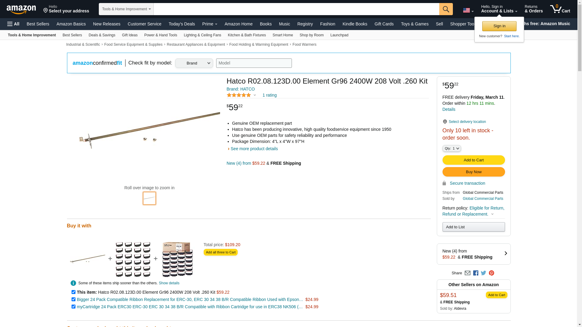 Hatco (HATCG) Kit, Element, Gr96, 2400W, 208V, (.260)