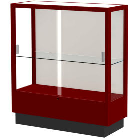 Waddell 8949Mx The traditional good looks and solid construction of The Heritage Series make our hardwood frame cases the most popular in the Waddell line. With their classic styling, Heritage Series cases will stand the test of time as well as they stand up to school environments. Features: -Standard sliding tempered glass doors -Includes one 12" full-length shelves with brackets -Built in locks and levelers -Choose from plaque fabric, mirror, or white laminate backing -Plaque fabric backing is an off-white color and is designed to work with Velcro and will allow easy mounting -Reflective mirror back adds luster and class -White laminate background is constructed of melamine and is washable and stain-resistant -Choose from 3 hardwood finishes: Honey Maple, Danish Walnut, and Cordovan -Dimensions: 36" L x 40" H x 14" D (including 10"H base) Case Back: Plaque Fabric, Wood Color: Cordovan