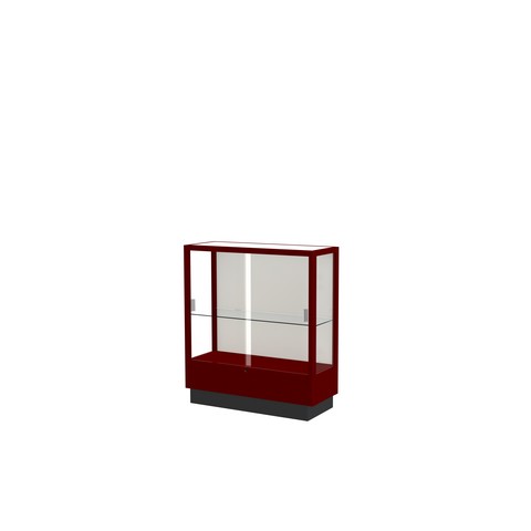 8949M-PB-C Backing: Plaque Fabric, Wood Finish: Cordovan Features: -Sliding, tempered glass doors. -Reflective mirror back adds luster and class. Product Type: -Trophy display case. Lighting Available: -Yes. Design: -Counter/Tabletop. Display Material: -Glass. Country of Manufacture: -United States. Frame Material: -Wood. Adjustable Shelves: -Yes. Dimensions: Overall Height - Top to Bottom: -40". Overall Width - Side to Side: -36". Overall Depth - Front to Back: -14". Overall Product Weight: -116 lbs. Shelf Length - Side to Side: -12".