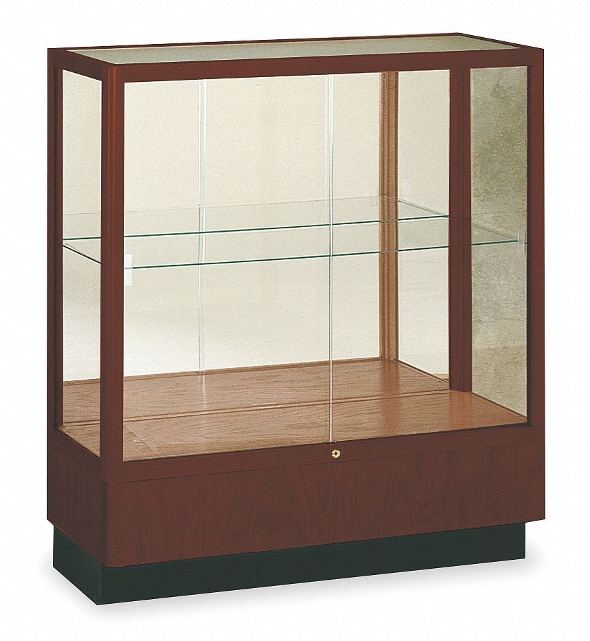 - Wooden display cases on a 10" high base include sliding tempered glass doors, built-in locks, steel shelving hardware, and levelers.