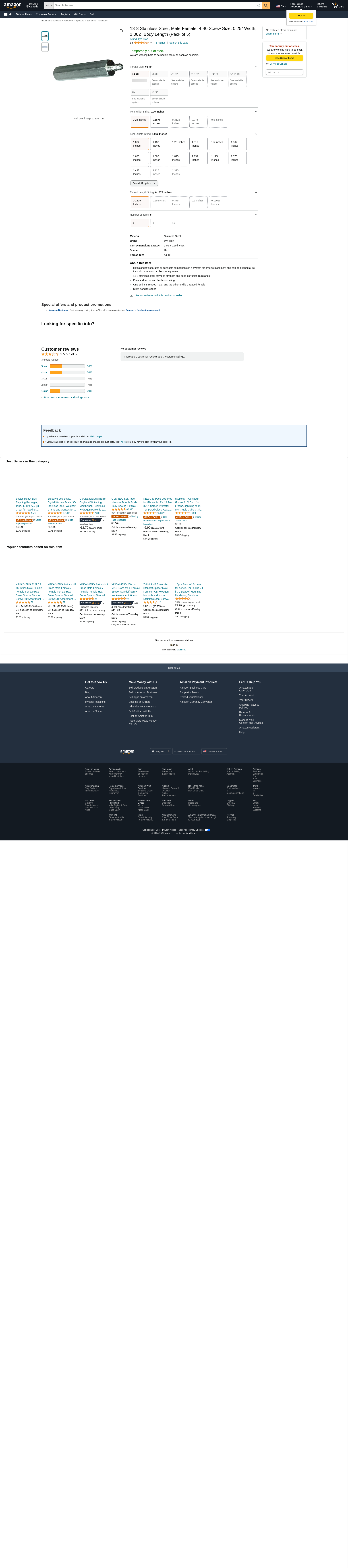 Lyn-Tron, 18-8 Stainless Steel, Male-Female, 4-40 Screw Size, 0.25" Width, 1.062" Body Length (Pack of 5)