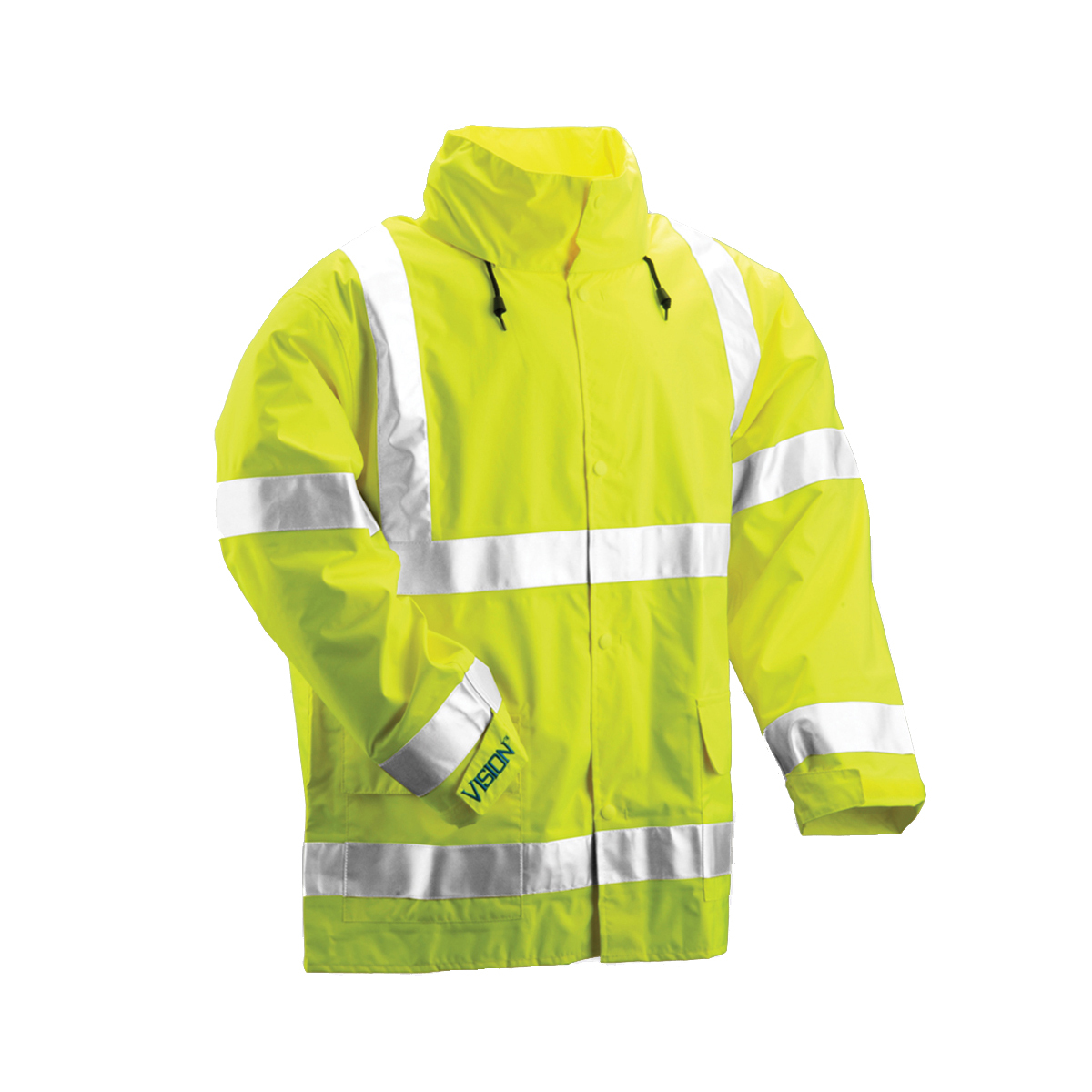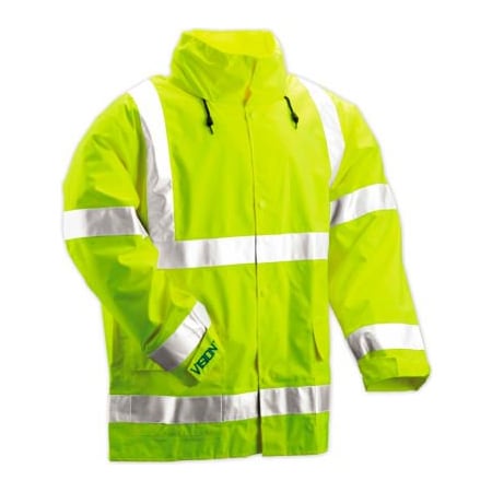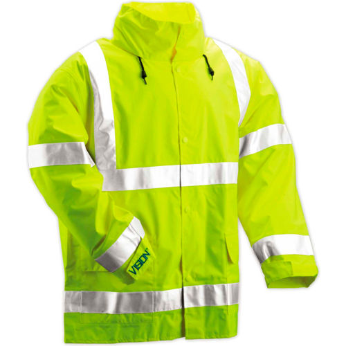 Yellow-green, breathable polyurethane on 150 denier polyester; 2" silver reflective tape; 360° nighttime conspicuity; 100% waterproof; 90° sleeve-to-body angle; taped seams; roll-away hood; cargo pockets; meets ANSI/ISEA 107 Class 3 standard.