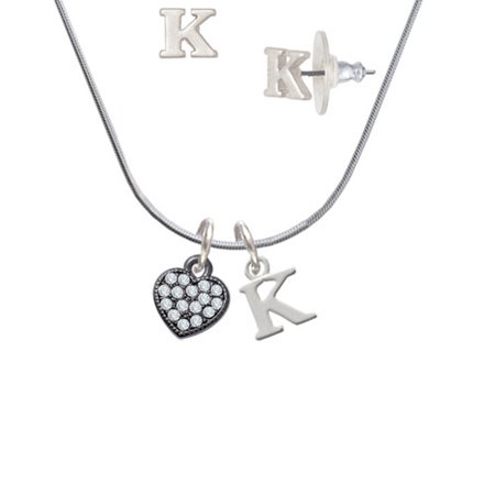 Black Nickel Tone Small Black Heart with Clear Crystals - K Initial Charm Necklace and Stud Earrings Jewelry Set. Black Nickel Tone Charm. Mini Initial Stud Earrings are approx. 0.28 x 0.34 inches (HxW) with steel posts. Earring backs are Bullet ''Clutch'' Style with Plastic Pad. Small Initial Pendant is approximately 0.45 inches tall including loop. 18 Inch Snake Chain Necklace with a Lobster Claw Clasp. Charming jewelry set makes a wonderful personalized gift. Featured necklace is an exclusive Delight & Co. design. We are a family owned company for over 35 years in the U.S.A. PLEASE NOTE: Our products are lead safe, but are not intended for children 14 years and younger.