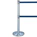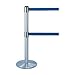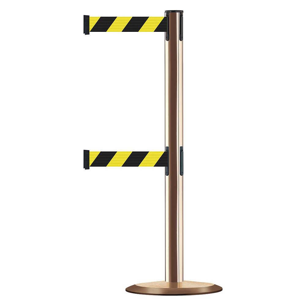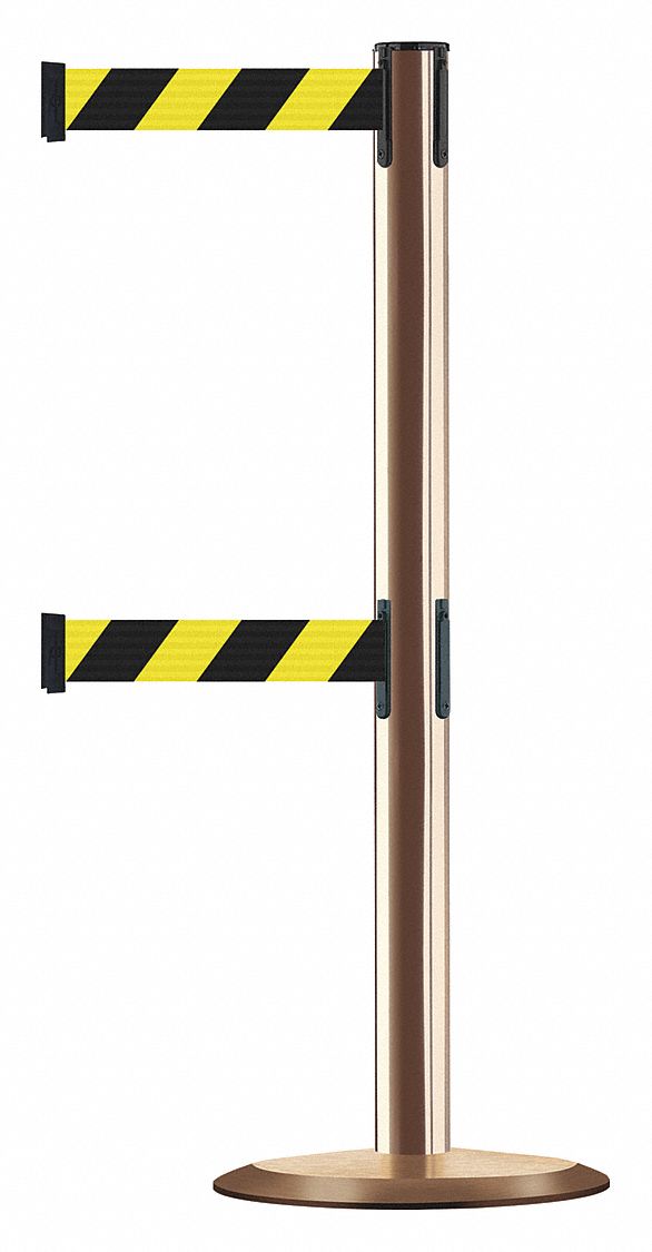 Barrier Post with Belt, Post Material Steel, Post Finish Polished Brass, Post Height 38 in, Post Dia. 2 1/2 in, Base Type Standard, Base Dia. 14 in, Base Material Steel, Base Finish Polished Brass, Number of Belts 2, Belt Length 7 1/2 ft, Belt Color Black and Yellow Diagonal Striped, Belt Width 2 in, Indoor, ADA Compliance Yes