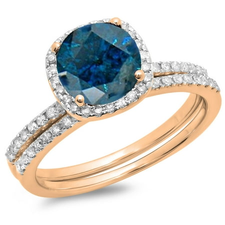 All of love's most precious moments shine through this romantic treasure. In 10K Rose Gold totaling 1.75 ct. create the bridal set of her dreams. Ask her to be yours with the eye-catching engagement ring which features a diamond -studded shank and frame surrounding a 1.50 ct. round cut blue diamond that radiates remarkable shine at the center. On your wedding day complete the ensemble with the coordinating wedding band also lined in diamonds. This mesmerizing bridal set is a beautiful beginning to a lifetime of love.