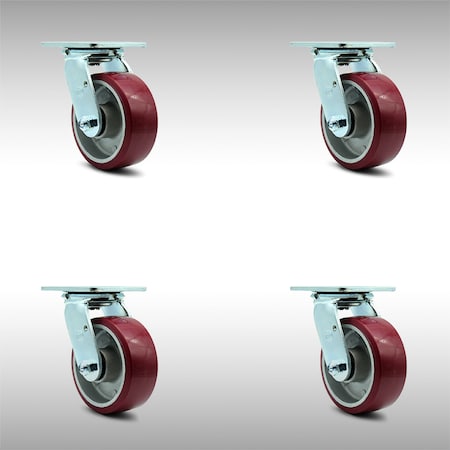 Stainless Steel Polyurethane on Aluminum Swivel Top Plate Caster Set of 4 w/5" x 2" Maroon Wheels - Includes 4 Swivel - 3600 lbs Total Capacity - Service Caster Brand