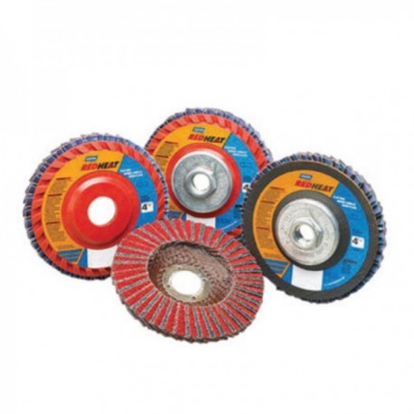 Featuring a ceramic/zirconia alumina abrasive, this conical disc is designed for light stock removal, blending, and finishing in a single operation. Angled flaps make it ideal for both contoured and edge work. The trimmable, flexible plastic back plate wears away as the flap disc grinds and is highly conformable.<br /><br /> Item: Flap Disc<br /> Abrasive Disc Type: Type 29<br /> Disc Diameter: 4-1/2"<br /> Mounting Hole Size: 7/8"<br /> Abrasive Grit: 80<br /> Abrasive Grade: Medium<br /> Disc Backing Material: Fiberglass<br /> Abrasive Material: Ceramic<br /> Abrasive Type: Coated<br /> Series: Redheat<br /> Backing Weight: Y<br /> Max. RPM: 13,300