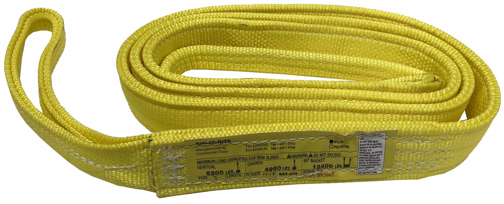 As an Amazon Associate, we earn from qualifying purchases. WEB SLING, TYPE 3, FLAT EYE AND EYE, 2-PLY, YELLOW, 2 FT X 2 IN, 12 IN EYE, NYLON CONTINENTAL . EE2902X2T3NK Gallery Attributes Brand name, Manufacturer name, ManufacturerCONTINENTAL Attribute00Web Sling Attribute016,200 lbs. Attribute022 in Attribute03Nylon Attribute0412,400 lbs. Attribute0512 in Attribute06B30.9 Attribute07Eye and Eye Attribute082 ft Attribute092 Attribute104,960 lbs. Attribute11None Attribute12Yellow Attribute1310,700 lb AttributeKey00Item - Web Slings AttributeKey01Vertical Hitch Capacity AttributeKey02, width_AttribSling Width AttributeKey03Sling Material AttributeKey04Basket Hitch Capacity AttributeKey05, length_AttribEye Length AttributeKey06Standards AttributeKey07Sling Type AttributeKey08Sling Length AttributeKey09Number of Plies AttributeKey10Choker Hitch Capacity AttributeKey11Wear Resistant Cover AttributeKey12Colour AttributeKey13Sling Capacity @ 60 Degrees DimensionUnitinch Extra Product NameWEB SLING, TYPE 3, FLAT EYE AND EYE, 2-PLY, YELLOW, 2 FT X 2 IN, 12 IN EYE, NYLON UNSPSC24101637 Weight0.67 WeightUnitlbs length12.0 moq, multiple1 MPNEE2902X2T3NK originalCurrency{'currency': 'CAD'} qtyInStock0 SKUCCGEE2-902X2T3N snippetFind your CONTINENTAL WEB SLING, TYPE 3, FLAT EYE AND EYE, 2-PLY, YELLOW, 2 FT X 2 IN, 12 IN EYE, NYLON at Grainger Canada, formerly Acklands-Grainger. We have been Canada's premiere industrial supplier for over 125 years with superior service and quality. width2.0 Distributor offers SellerSKUMOQIn stockMultiplePrices grainger.caCCGEE2-902X2T3N11