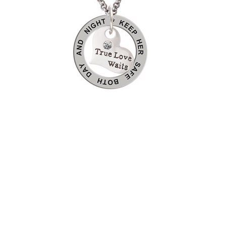 Silver Tone Small True Love Waits Heart Keep Her Safe Both Day And Night Affirmation Ring Necklace. Silver Tone Small True Love Waits Heart Keep Her Safe Both Day And Night Affirmation Ring Necklace is approximately 0.57 x 0.53 x 0.12 inches (HxWxD) including loop. Heart with antiqued words and clear crystal on the front. Small antiqued flower on the back. Silver tone 2mm Belcher Chain Necklace is approx. 24 Inches with a Lobster Claw Clasp. Affirmation Ring is approx. 0.86 x 0.86 x 0.05 (HxWxD). This inspirational piece of jewelry is very meaningful. Its circular shape is symbolic for endless belief in the message that is imprinted around the ring. These are motivational or sentimental messages to the wearer. Perfect gift for that precious woman in your life. Tell her how much you care. PLEASE NOTE: Our products are lead safe, but are not intended for children 14 years and younger.