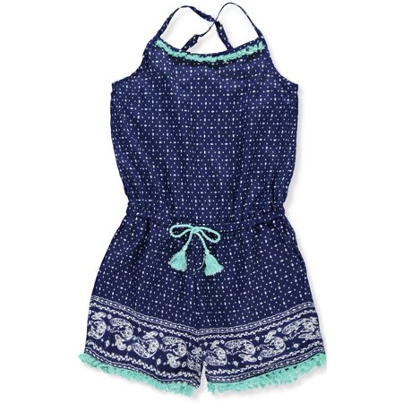 <ul> <li>Real Love romper</li> <li>Printed silky poly construction</li> <li>Frayed tassel trim</li> <li>Elasticated waist with braided tie accent</li> <li>Adjustable crisscross shoulder straps</li> </ul>
