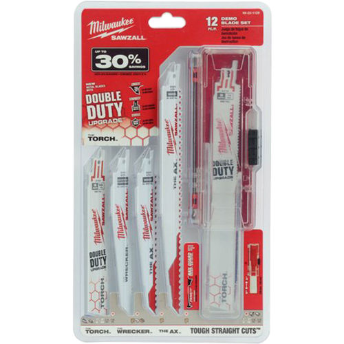 Features 12 of Milwaukee's most popular demolition blades. Kit includes 2 of each: No.48-00-5021 5/8 TPI, 6" Length, No.48-00-5026 5/8 TPI, 9" Length, No.48-00-5701 8 TPI, 6" Length, No.48-00-5787 14TPI, 9" Length. 4 each: No.48-00-5782 14 TPI, 6" Length and a canvas pouch for storing blades between use.