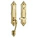 Configuration:Handleset for right-hand door, Finish:Satin Brass and Brown (RELIEVED) Baldwin's Estate collection entrance locksets come in a number of traditional styles and finishes that coordinate with Baldwin interior latchset designs. Estate collection locksets are constructed from forged brass with mechanical parts constructed from steel for maximum strength and smooth operation. The emergency exit locksets allow interior knob or lever to simultaneously retract both the latch bolt and deadbolt for quick exit. Deadbolt mechanism is highly secure, with security jamb screws, saw-proof bolt with 1' throw, dust box, and an armored front to conceal the fasteners. Comes with adjustable latch and deadbolt backset that fits 2-3/8' and 2' backsets, and is fully reversible for both left- and right-hand door setups. Designed for easy homeowner installation in standard pre-drilled doors and includes graphic installation instructions. 5' center-to-center distance between latch and deadbolt only. For doors 1' thick. Conversion kit for 2' thick and 2' thick doors available; see accessories. <