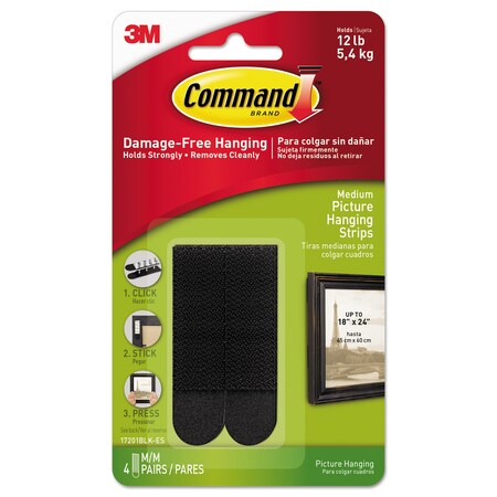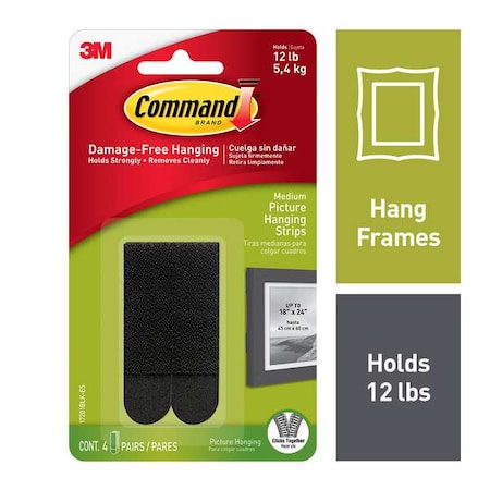Hanging Strip, Fastening Method Adhesive Back, Points per Hook Not Applicable, Number of Hooks 0, Basic Hook Material Foam, Hook Finish Unfinished, Working Load Limit 3 lb, Hook Height 2 3/4 in, Hook Base Width 3/4 in, Projection 0 in, Black, Hook Eye Inside H Not Applicable, Hook Eye Inside W Not Applicable, Depth 0 in, Thread Length Not Applicable, Includes (4) Pairs of Strips, Mounting Command(TM) Adhesive, Package Quantity 4