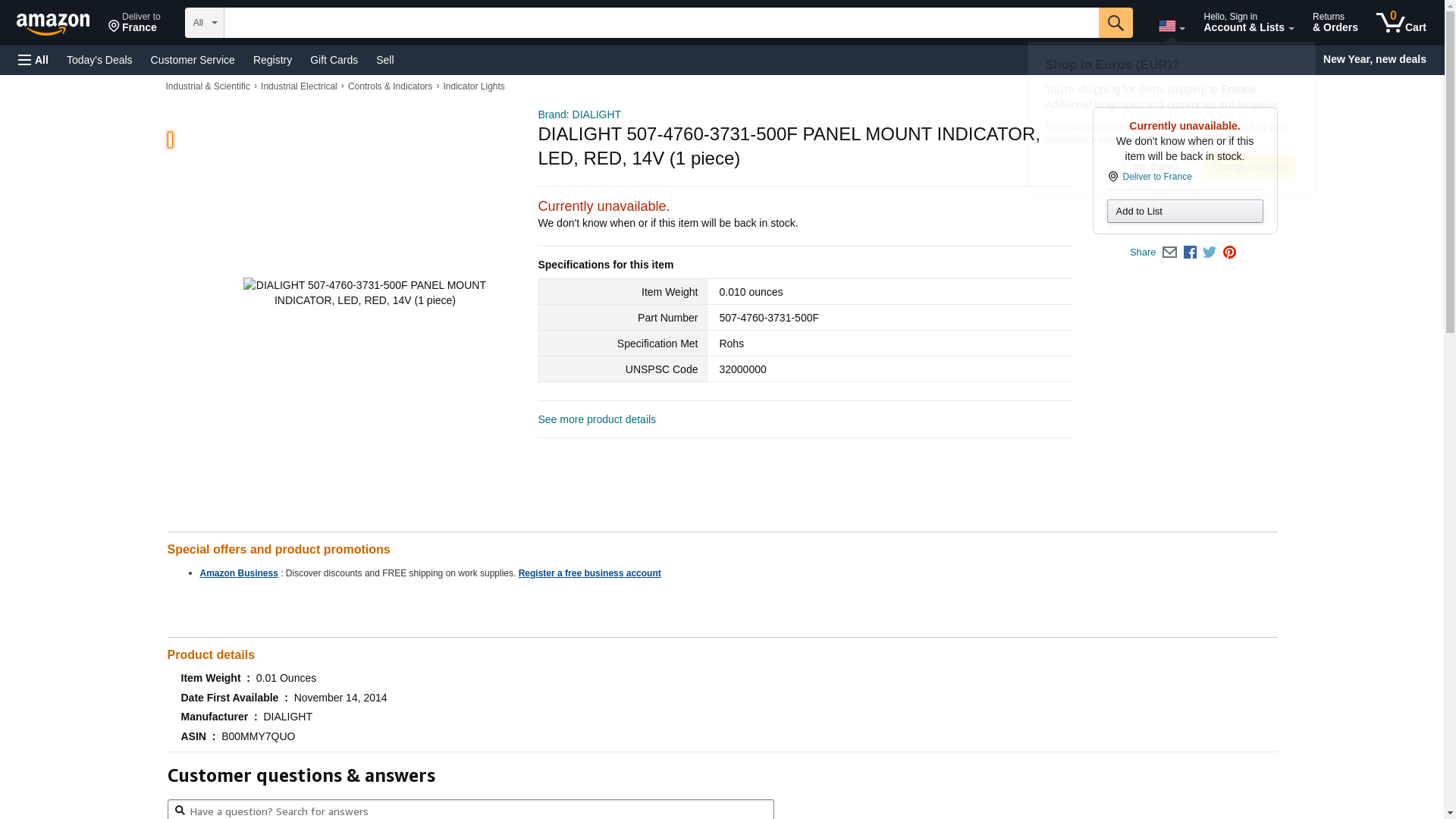 | Feature | DIALIGHT - 507-4760-3731-500F - INDICATOR, LED, RED, 10MCD, 14VDC |