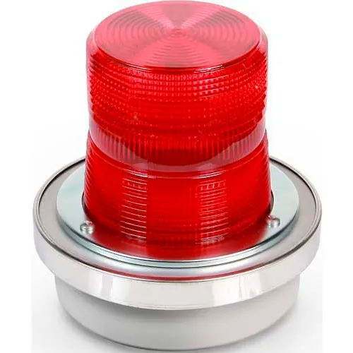'Warning Light, Color Red, Lamp Type 40W Halogen, Flashes per Minute 65, Light Output 265 Lumens, Lamp Life 25,000 hr., Lens Design Fresnel, Lens Material Polycarbonate, Housing Material Cast Steel, Mounting 1/2 In. NPT Pipe, Rating Weatherproof, Power Source 120VAC, Current Drawn .3 amps, Height 5-7/8 In.'