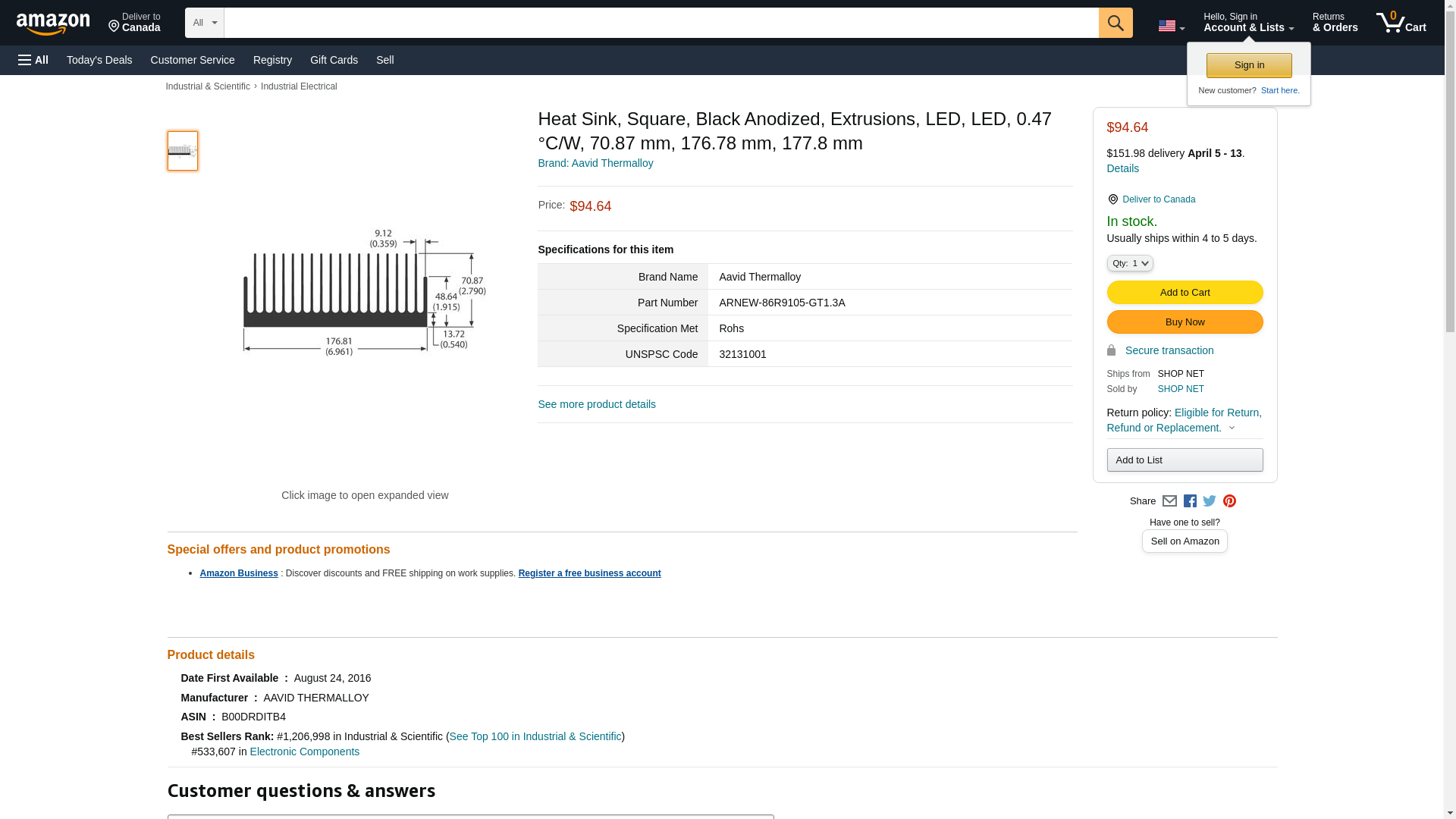 Heat Sink, Square, Black Anodized, Extrusions, LED, LED, 0.47 °C/W, 70.87 mm, 176.78 mm, 177.8 mm