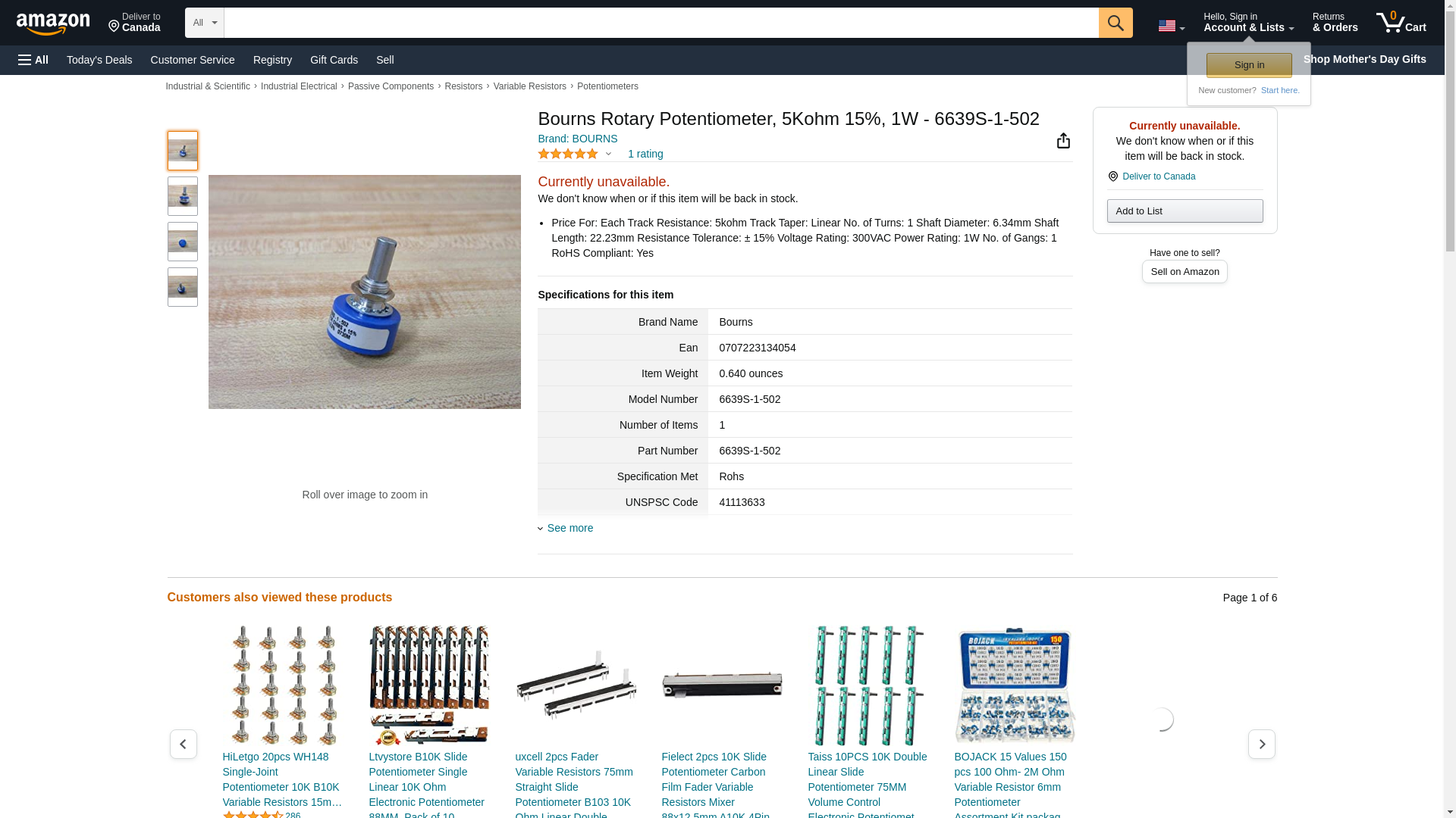 6639S-1-502, Res Pot 5K Ohm 15% 1W 1(Elec)/1(Mech) Turn 6.34mm (22.23 X 36.65mm) Turret Panel Mount (2 Items)